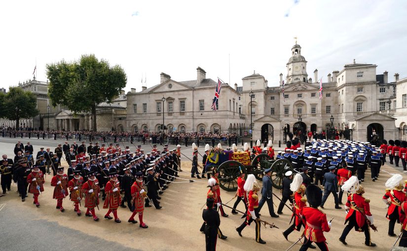 Picture: The coffin of Queen Elizabeth II is pulled past Horse Guards Avenue following her funeral service in Westminster Abbey in central London Monday Sept. 19, 2022. (David Davies/Pool Photo via AP)