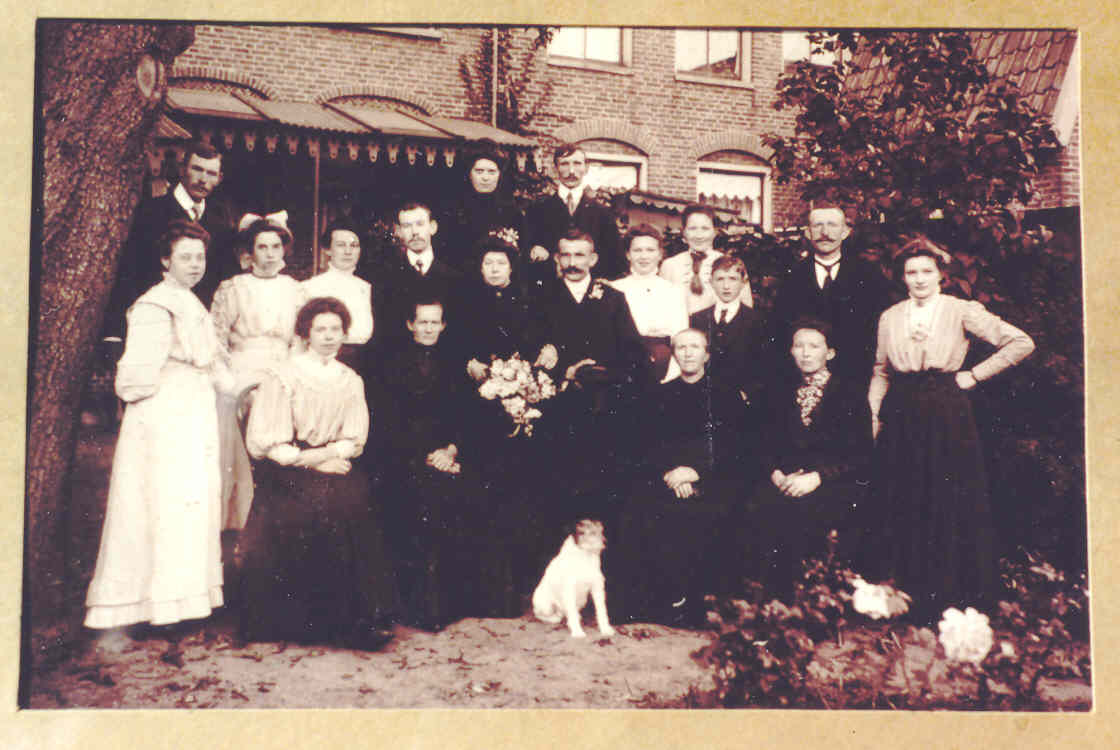 `My Oma Titia Grasdijk was born in 1882 (1969) and believed to be the oldest of 5 children. She attended the local school probably until she was 12 years old (Grade 6) and then helped in the household and probably soon after got a job as a ‘dienstmeid’ a popular job for a young teenage girl. Sometimes teenage daughters were able to obtain a position with a well-to-do family which greatly enhanced their status in the community. It is apparent that Oma in her twenties, sometime in the early 1900s, after the deaths of her sisters (1889 & 1897) and her dad Pieter Grasdijk in 1904, left for the city of Groningen and in those years met my Opa Jan probably as they attended church in the city. It is told that Opa Jan Schuurman (1881-1956) who was born in the village of Haren, close to the city Groningen had not yet done profession of his faith and so they attended study sessions at the church together. Apparently Opa Jan (or family?) had some issues and the local pastor would not confirm him as being eligible for saying his profession. My Oma small but an outspoken (feisty) young lady is said to have opinioned to the pastor: ‘Dan krijg je mij ook niet!’ (‘Then you won’t get me either!’). So some of the Schuurman-Grasdijk children were not baptized until they were older, my Dad was 5 years old. Here is a picture of the family when my Oma Titia & Opa Jan married in 1910 on September 1.